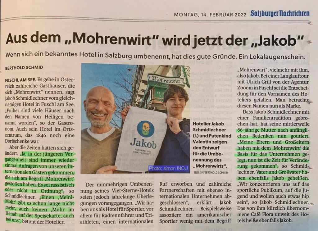 Besonders delikat wird es, wenn es um alteingesessene Bezeichnungen, Logos von Traditionsunternehmen und historischen Stätten geht. Ein mittlerweile berühmtes Beispiel ist die Vorarlberger Mohrenbrauerei in Dornbirn, deren Logo ein schwarzer Krauskopf mit wulstigen Lippen ziert. Schon seit Jahren flammt die Diskussion um das Logo immer wieder auf, bisher wurde aber von der Geschäftsleitung dementiert, blockiert und gemauert. Im Juni 2020 hagelte es im Rahmen der Black Lives Matter Anti-Rassismus Aktionen erneut Kritik für die Traditionsbrauerei – diesmal mit einem saftigen Shitstorm auf Facebook, der zur vorübergehenden Schließung des Kanals führte. Zu Beginn wurden seitens der Brauerei reflexartig dieselben Argumente wiederholt: Man sei fern von Rassismus, das Logo habe Tradition und werde sicher nicht geändert. Doch siehe da – ein paar Tage später gab die Brauerei bekannt, einen Markenprozess zu starten und das Logo von Expert:innen überprüfen zu lassen. Es bleibt also spannend – denn bis dato hat der Markenprozess noch kein sichtbares Resultat hervorgebracht…!